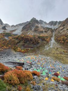 先ほどの写真の場所から平地を3時間、登山を3時間、時間がないのでほぼ休憩なし、徹夜明けの体に鞭を打ちやっと念願の涸沢カールにたどり着きました。日本一の紅葉ともいわれている通り山の迫力も相まって圧巻でした。ゆっくり景色を堪能したかったのですが、キャンプ場のチェックインがぎりぎりなので、30分ほど滞在して急いで下山しました。