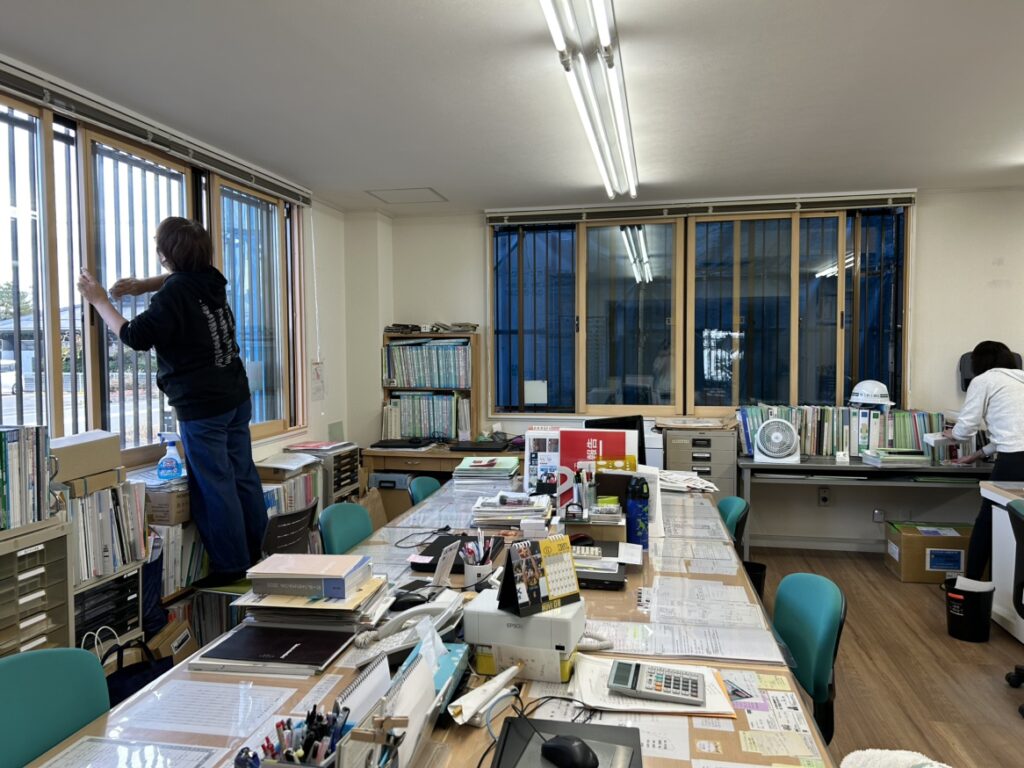 女性陣は社内を担当し、デスク周りをはじめ、会議室・商談室・書庫・ロッカールーム・社員用玄関、さらに給湯室やトイレ、エアコン、窓まで細かい部分を丁寧に掃除しました。