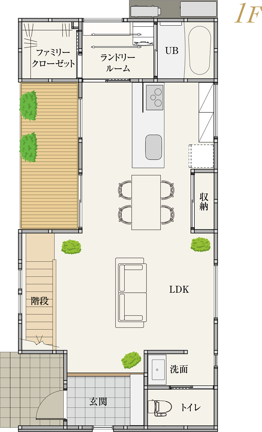 キッチン横に家事導線を考えたユーティリティルームとファミリークローゼットを配置。