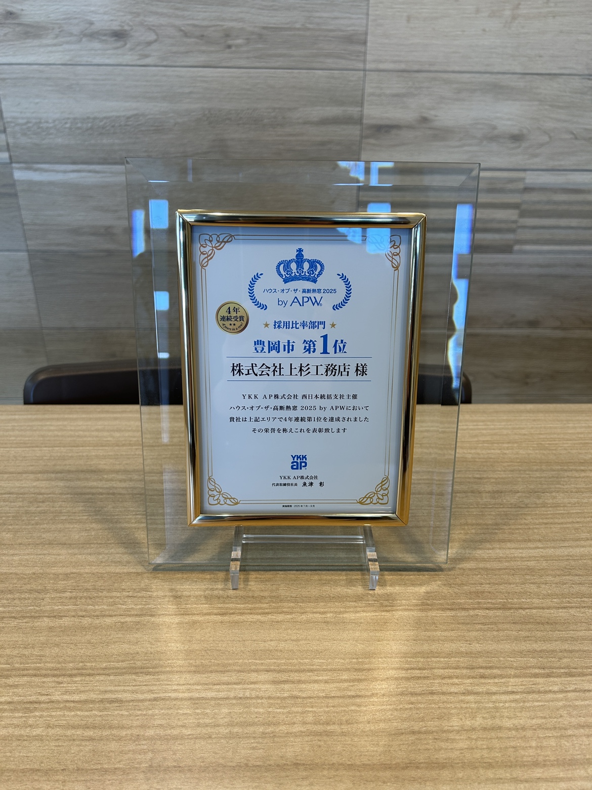 上杉工務店がYKK「高断熱窓採用比率」【豊岡エリア】4年連続第1位を受賞