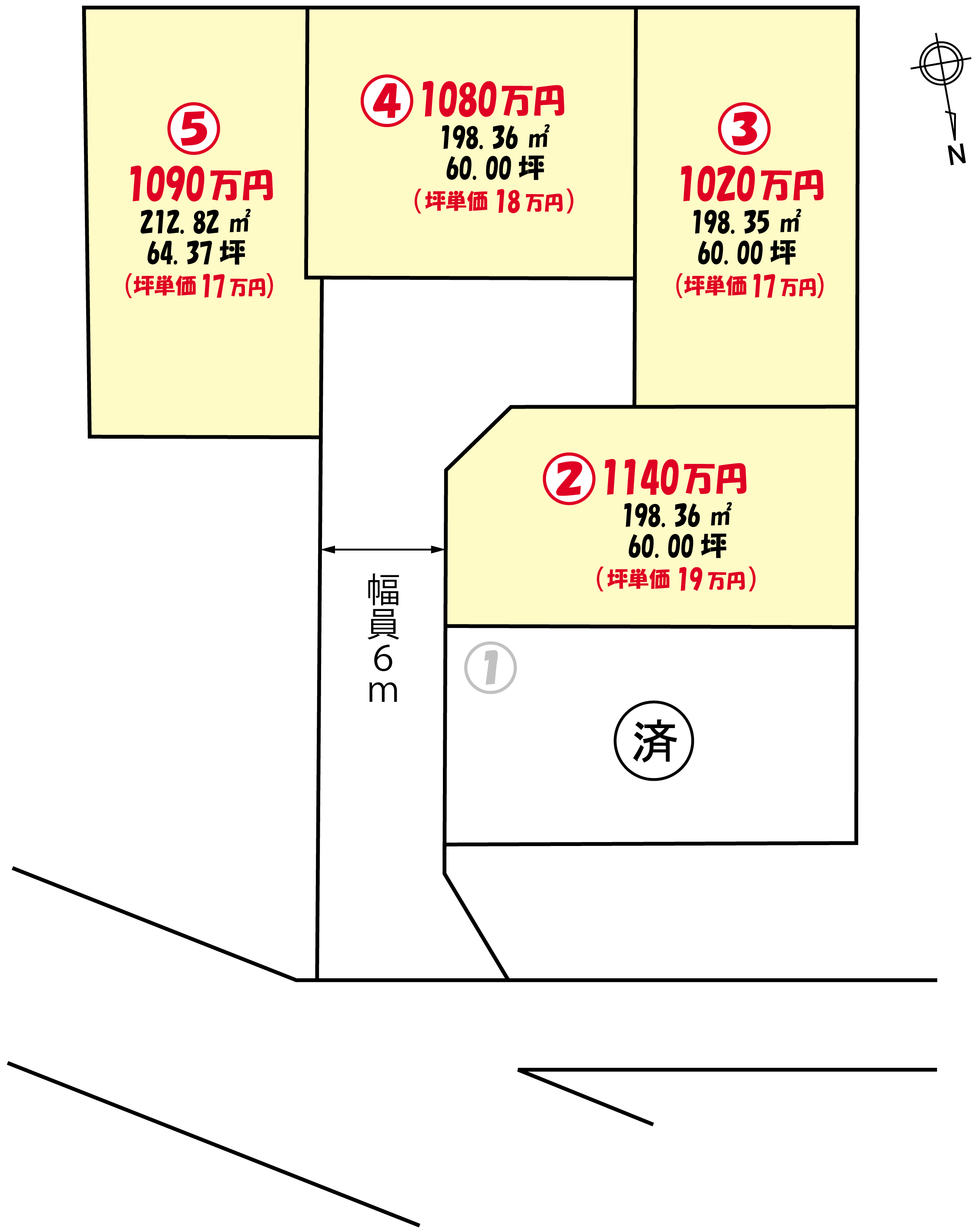 - ②1140万円(坪単価:19万円) ③1020万円(坪単価:17万円) ④1080万円(坪単価:18万円) ⑤1090万円(坪単価:17万円)